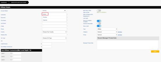 Step3: Help Affiliates to fill in all the information, change status to Active. Click on “Save”