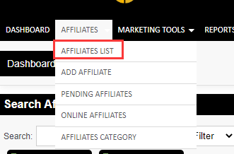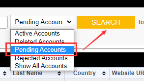 Step 3: In Affiliates list report, choose Pending Accounts, and click on “Search”, shows all pending approving affiliates.