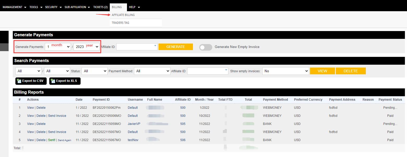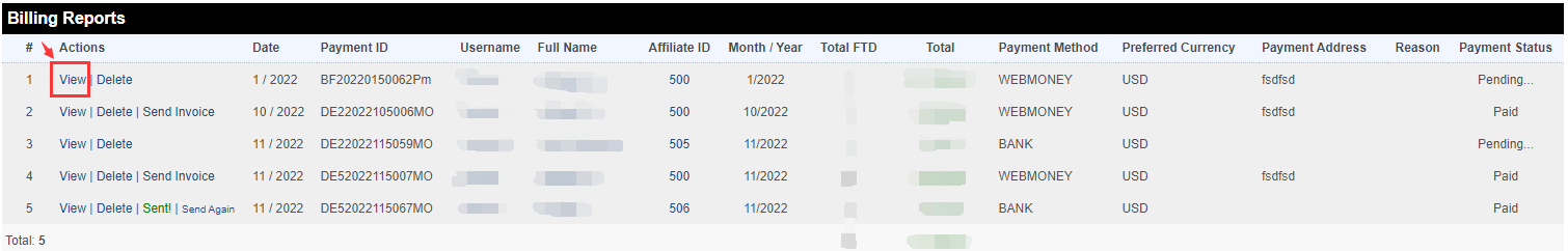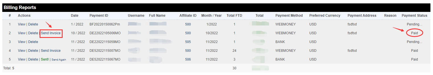 Step 8: Come back to Billing report, choose the invoice that just Save Changes, and click on "Send invoice", affiliate will get this invoice with commission details. And the payment status will change to "Paid"