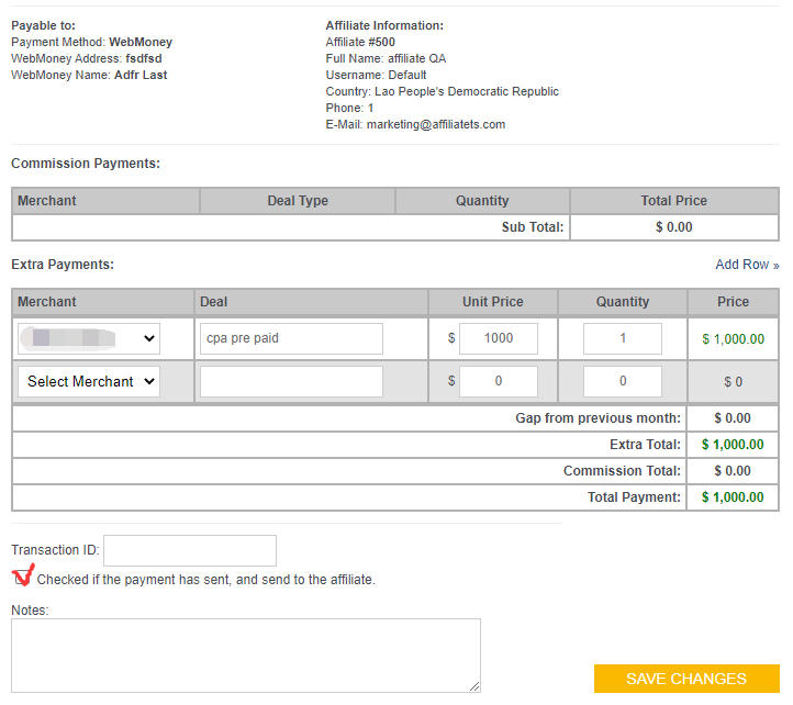 Step 7: Click on "Checked if the payment has sent, and send to the affiliate", and then Click "Save Changes"