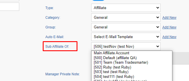 Step 3. Scroll down to sub affiliate of: and choose which affiliate is a "parent" of current affiliate, after click on save