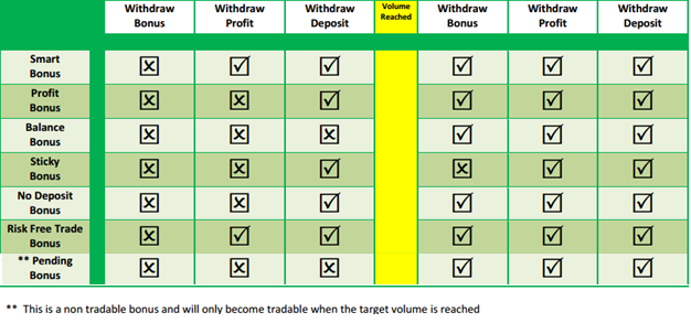 | Pending bonus | user gets bonus only after reaching volume, stright to cash | no | yes | yes | no | 10-300% | optional | sales/retention - user wants mid-high bonus and has confidance in trading | ||