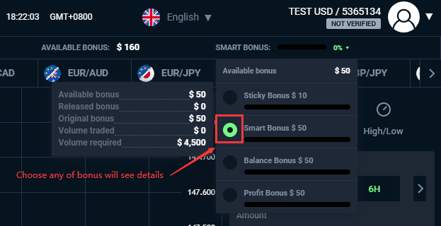 The target volume is the volume the user needs to trade in order to release the bonus or any related profit/deposit, and remove any restrictions from the bonus. Volume is valid only when a trade reaches the expiry time. For example, Sellback or Risk Free Trades are not being calculated towards trading volume in that matter. In case user has more than one bonus, volume will count towards the active bonus. Once a bonus has reached its target, it will automatically change its status and release the bonus amount to cash.