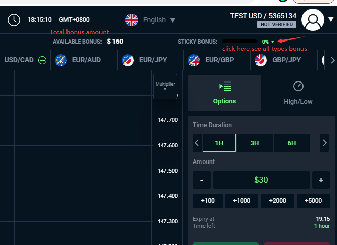 In the case that part of a bonus is invested (a trade is opened) at the time of deposit, the cap will be reduced but may be increased up to its previous amount in the case there will be a positive return on expiration.