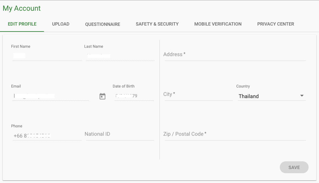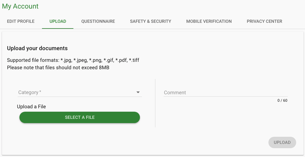 - Upload documents - allowing the user to upload KYC documents