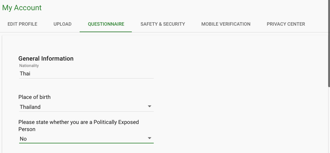 - Questionnaire - allowing the user to see his questionnaire (filled during registration process - for regulated brands)