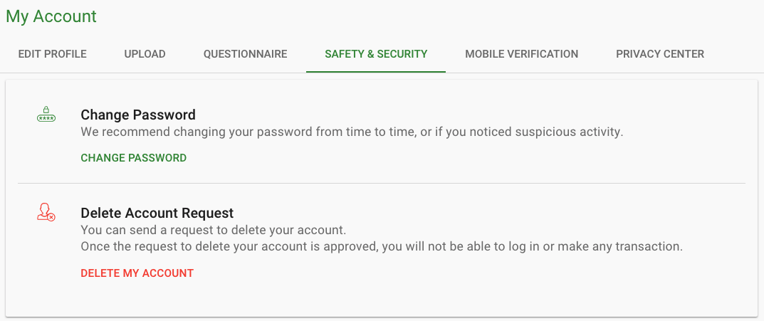 - Safety & Security - allow the user to change his account's password while logged in, or request to delete his account.