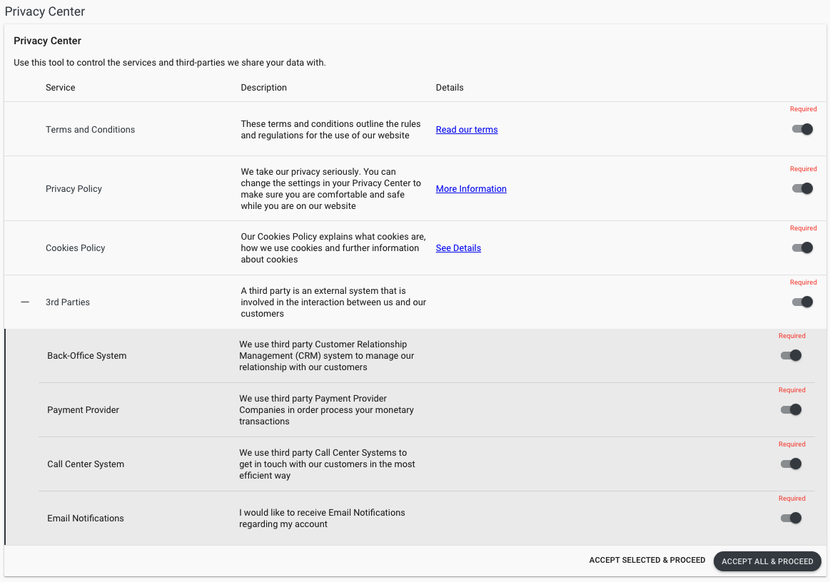 - Privacy Center - allow the user to consent for different terms, conditions and policies.