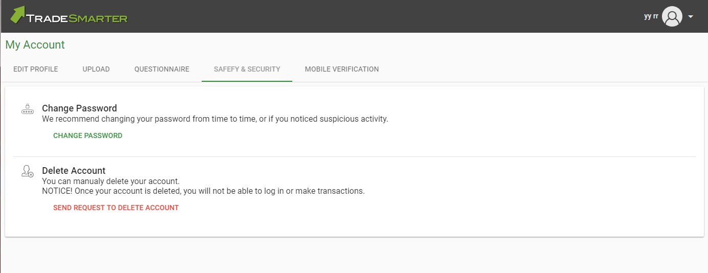 Delete request Option - inside "Safety & Security" tab - Replacing the “Change Password” tab.