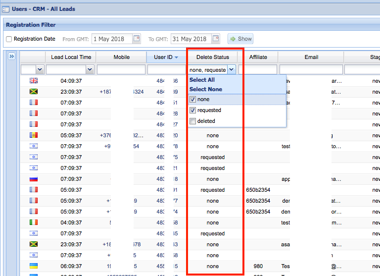 New column added to different “Leads” reports, showing the status of the user in terms of deletion: