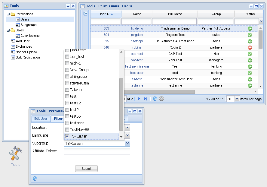 To allow a back office user to only see leads from a subgroup, you will need to add it to the users filters in his back office permissions. You will need to access this through the “tools” icon and then click on “users”. Select the user and then the subgroup and click “submit”Â
