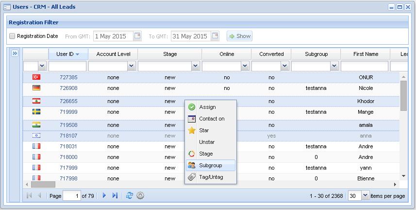When a lead registers on the platform the back office user will see the lead automatically assigned to this subgroup with the permission to access the “all leads” report or will see leads from this subgroup in their “my Leads” report once the lead has been assigned to them.Â