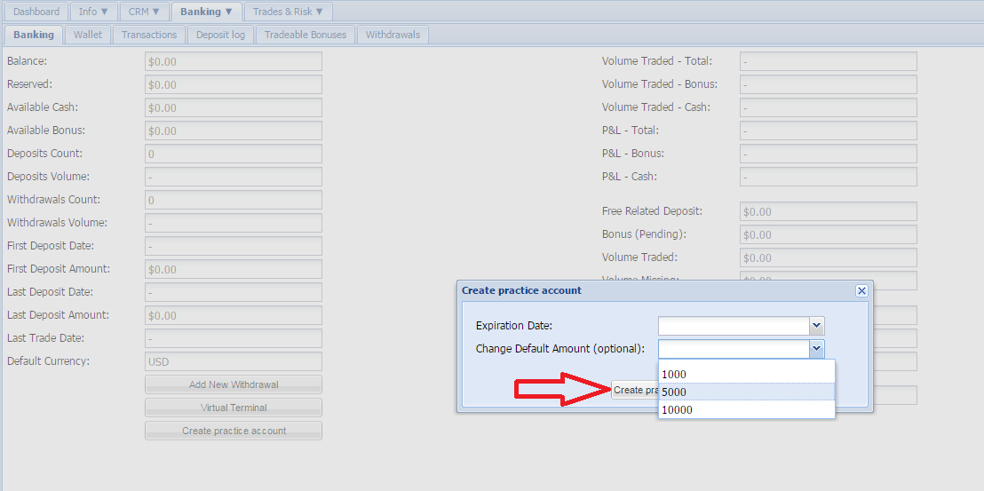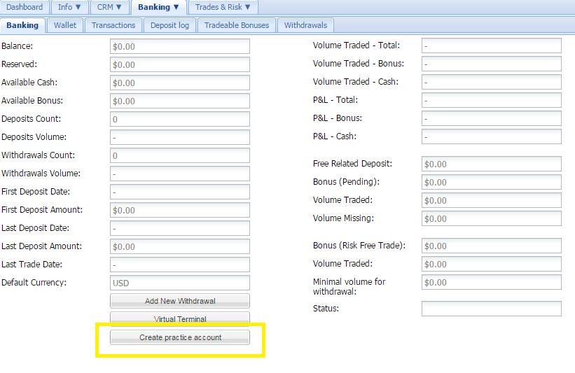- In the banking tab, the CRM user can click on "Create practice account" button.