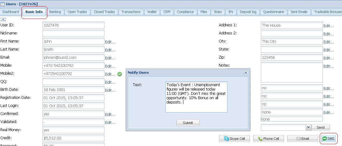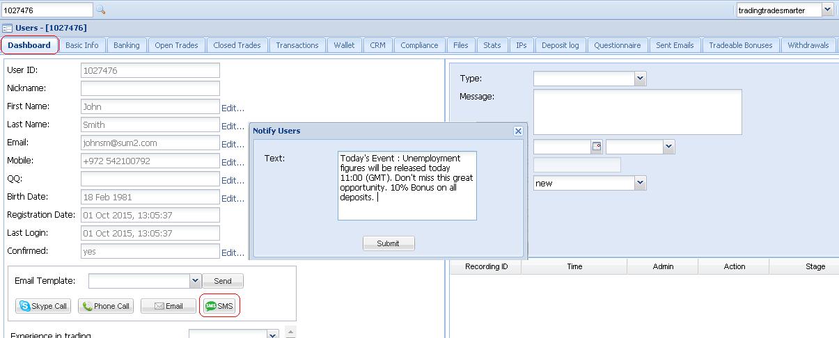 Our SMS function allows you to send text messages. Your team can have instant contact with their clients with the click of a button and you can send individual or bulk messages. You can use this function for campaigns or to drive deposits through event messaging. Please note that this feature requires integration with Nexmo.