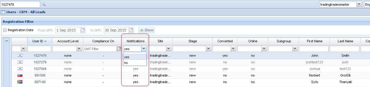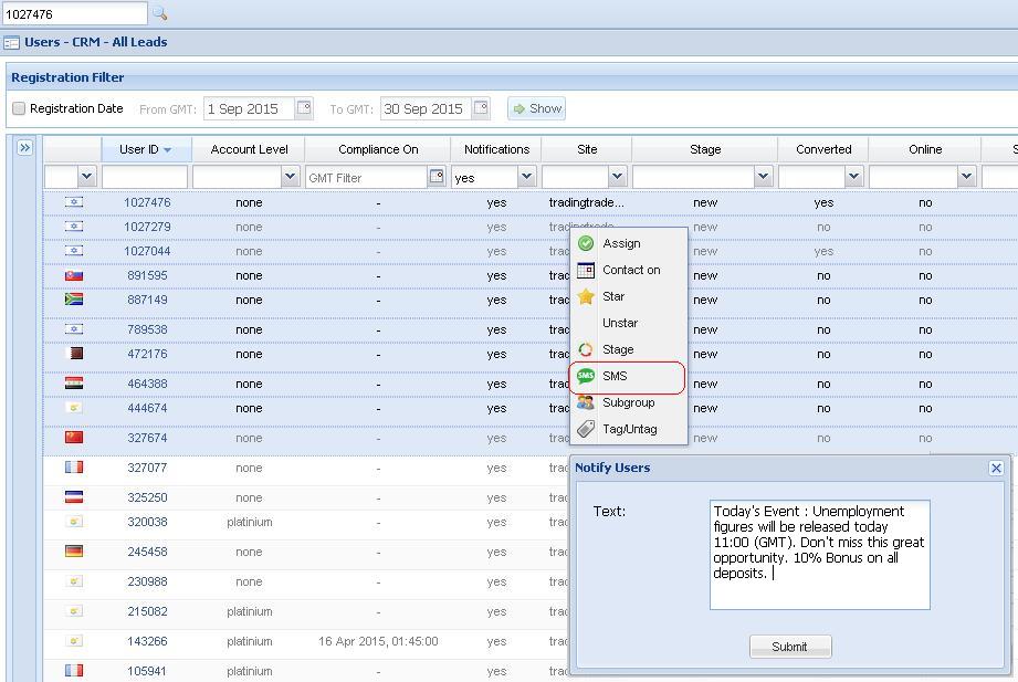 You can also send to individual Users or bulk Users directly from the "All Leads Report" by right clicking and choosing SMS from the drop down menu. Remember that only users that have verified their mobile through the platform can receive SMS messages so it is advised to filter the report with "Notifications - Yes"